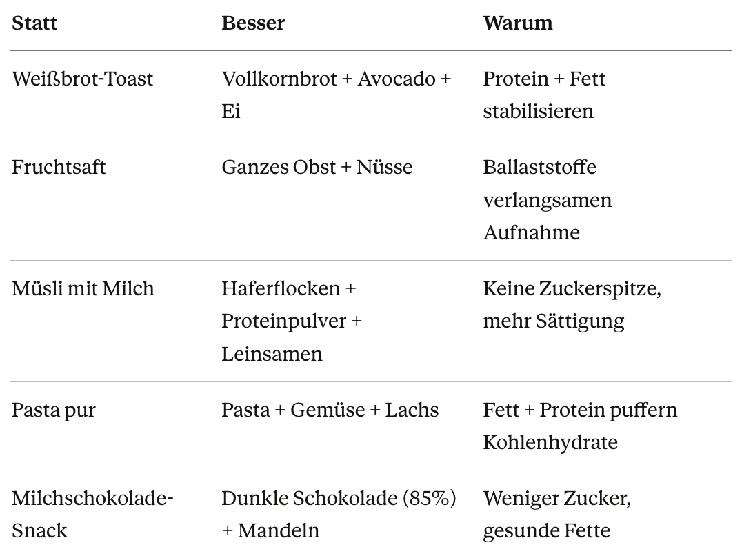 Ein Apfel allein ist eine Blutzucker-Rakete. Apfel plus Mandelbutter = stabil. Hummus plus Gemüse = stabil. Das Prinzip: Immer Kohlenhydrate mit Protein oder Fett kombinieren.