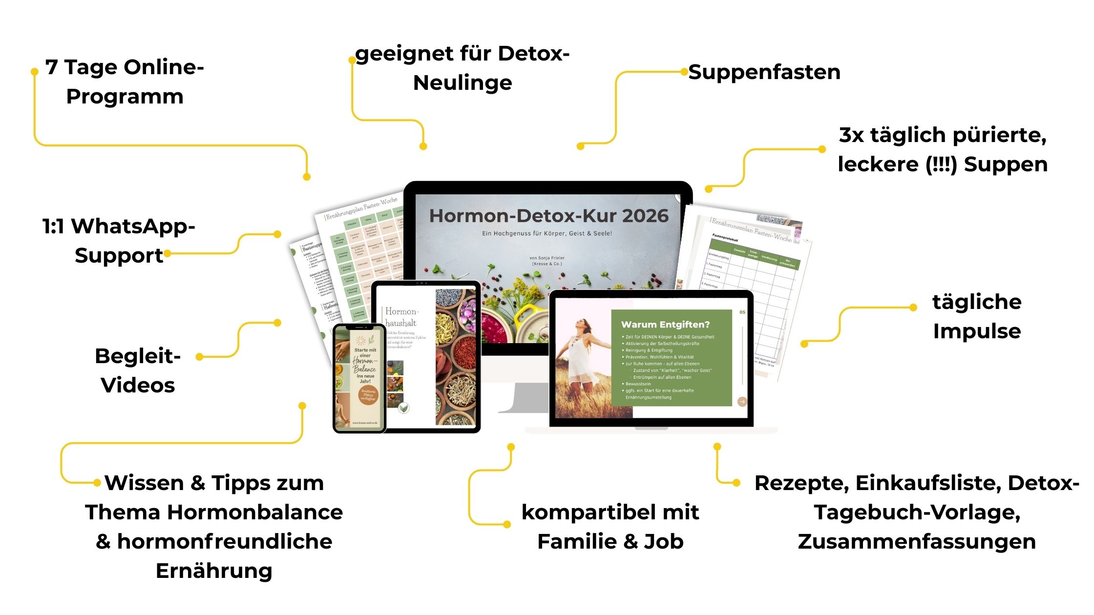 Die Hormon-Detox-Kur ist ein 7-tägiges Online-Programm, das auf sanftem Suppenfasten basiert – speziell entwickelt für Frauen, die ihre Hormone natürlich in Balance bringen wollen. Anders als beim klassischen Heilfasten verzichtest du nicht komplett auf Nahrung. Stattdessen gibt es 3x täglich warme, pürierte & nährstoffreiche Suppen, die deinen Körper entlasten, ohne dich hungern zu lassen. Diese Methode ist absolut anfängerfreundlich, alltagstauglich und kann problemlos neben Job und Familie durchgeführt werden.